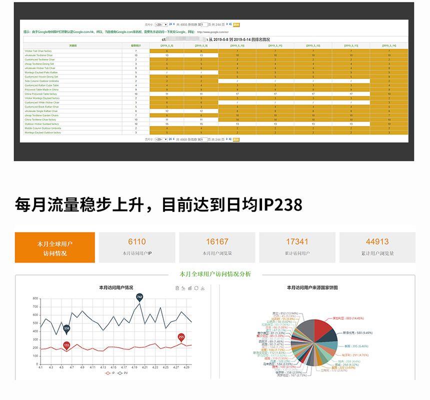 谷歌優化推廣哪家好?推薦深圳市思億歐服務中心專業的谷歌優化推廣公司,我們的Google網站推廣家具案例客戶公司位于廣東省佛山市順德市世界家具中心,我們的公司成立于2006,在過去的12年里,公司一年比一年強大,現在我們的產品從最開始的一個國家銷往世界各地的100多個國家。目前已與外貿快車合作近2年時間,在合作期間客戶很重視網站的運營和維護,每個月新增產品及關鍵詞在70多個以上。目前關鍵詞排名在谷歌首頁的數量為459個,日均IP達到238個,并且呈穩步上升的趨勢,單月詢盤已突破100封(不包含直接發送郵件到郵箱的詢盤)。