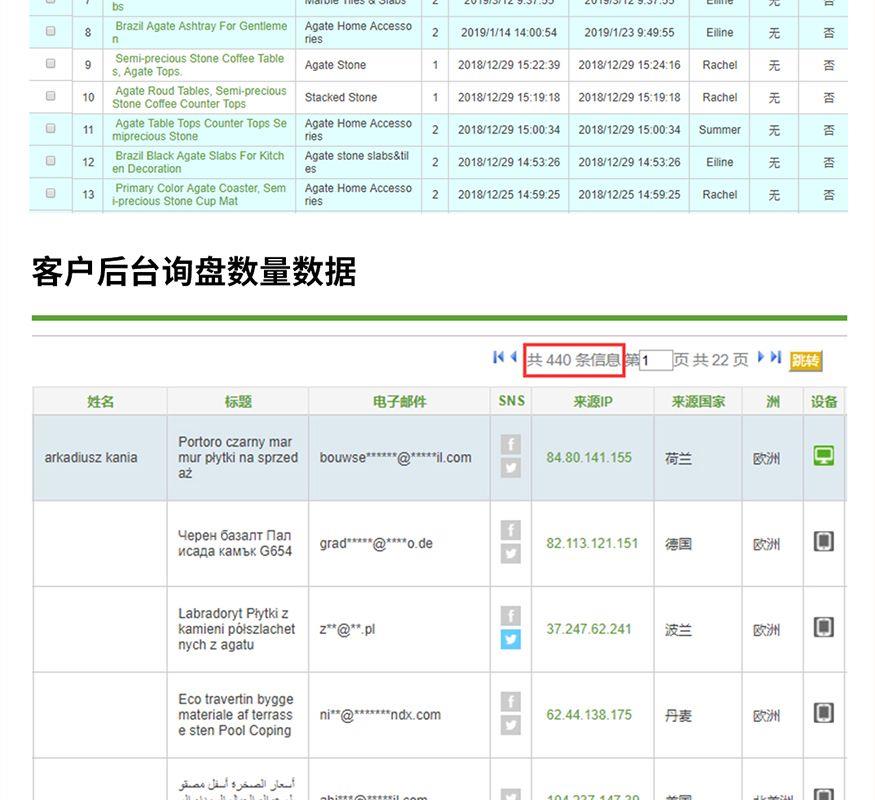 客戶自開通外貿快車以來,一直注重平臺的運營及維護工作,目前網站已發布1340個產品,70%以上的產品相似度都保持在75%以下。頁面數量多、質量高,因此被谷歌收錄的頁面數量也多,進而大大提升了網站的流量。目前網站日均流量高已突破300個,后臺共計收到400多個詢盤(不包含客戶直接發郵件至郵箱的咨詢)。