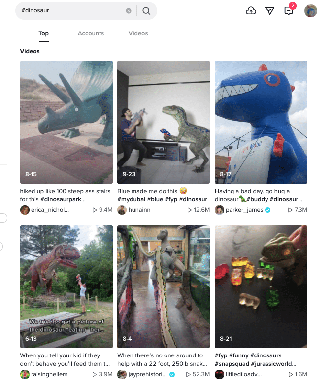 他們還可以讓對特定主題感興趣的人發現您的內容,這些人可能正在搜索特定的短語或標簽。例如,如果我想看一些關于恐龍的視頻(誰不想呢?),我可以只搜索標記為#dinosaur 的視頻,然后在剩下的晚上繼續閱讀三角龍的內容。